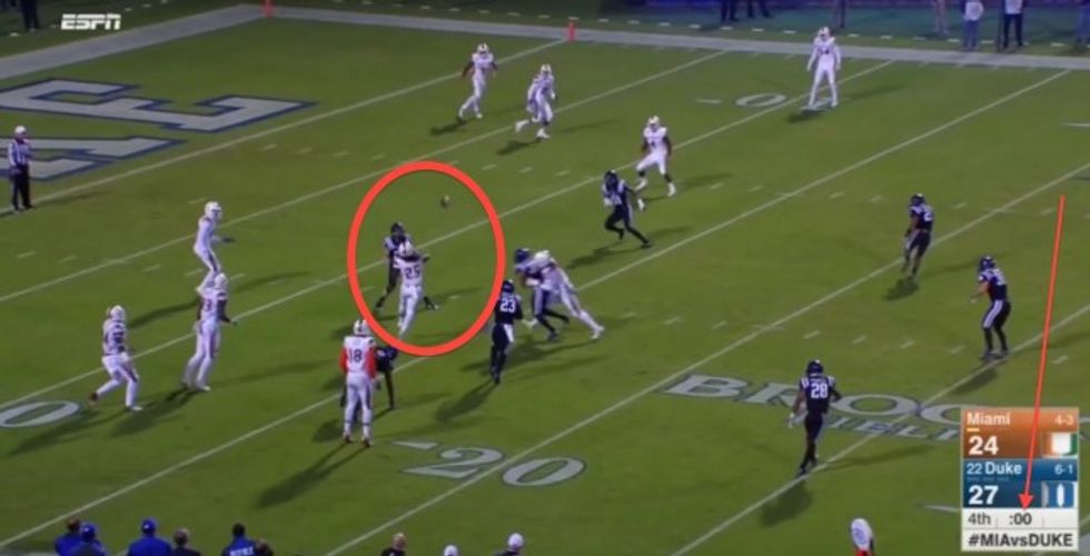 DURHAM, N.C. (TheBlaze/AP) � Corn Elder took Miami's eighth lateral of a wild final kickoff return and brought it back 75 yards for a touchdown that gave Miami a 30-27 victory over No. 22 Duke on Saturday night.