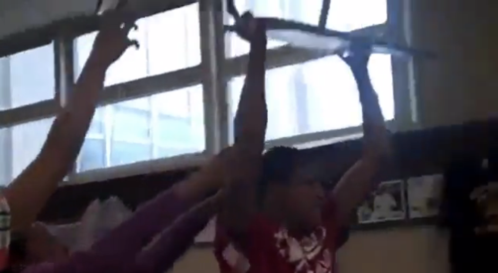 As an unruly student verbally berates a teacher, upends classroom furniture and tosses objects at the teacher, the rest of the rowdy students laugh and egg him on — and it was all captured on a student's cellphone video.