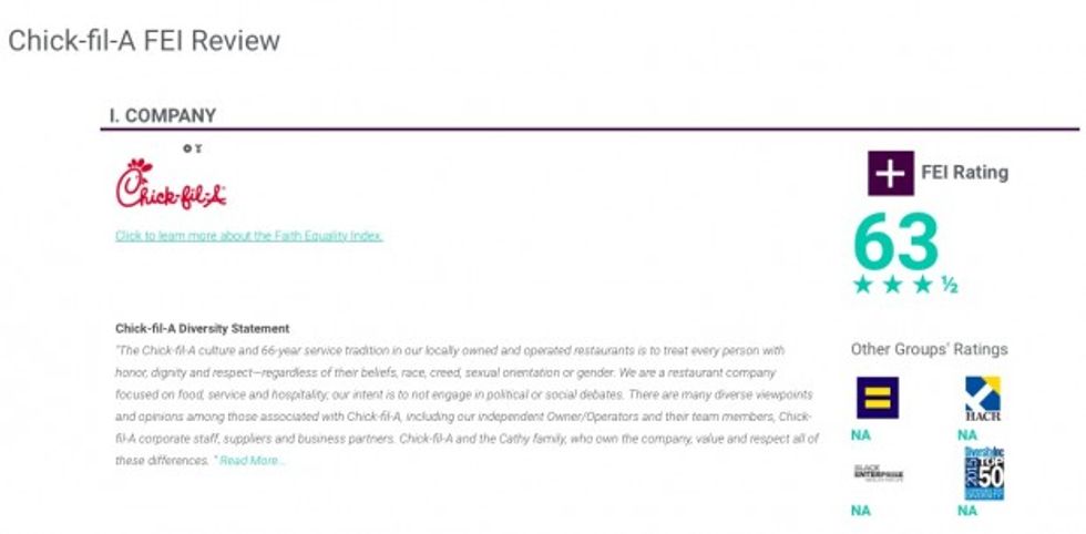 The Faith Equality Index rates companies on a scale from zero to 100, though a quick look at the top seven companies in the first wave of the index might cause some pause. Chick-fil-A, which tops the list, comes in at just 63, with Hobby Lobby at 62, Interstate Batteries at 61, Tyson Foods at 60, Cracker Barrel at 53, Walmart at 51 and Thrivent Financial at 50.