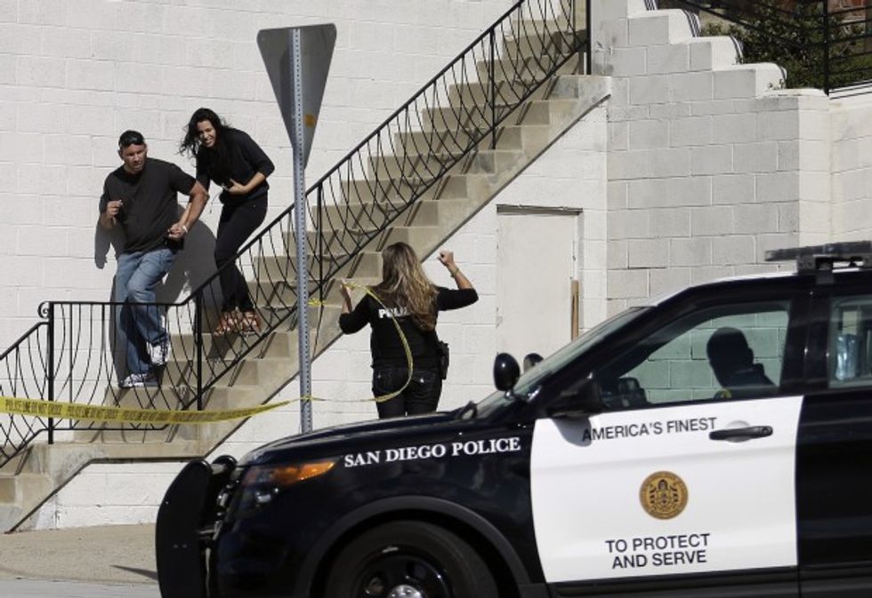 San Diego police officers assist a couple as they evacuate a building in San Diego on Wednesday, Nov. 4, 2015. (AP Photo/Gregory Bull)
