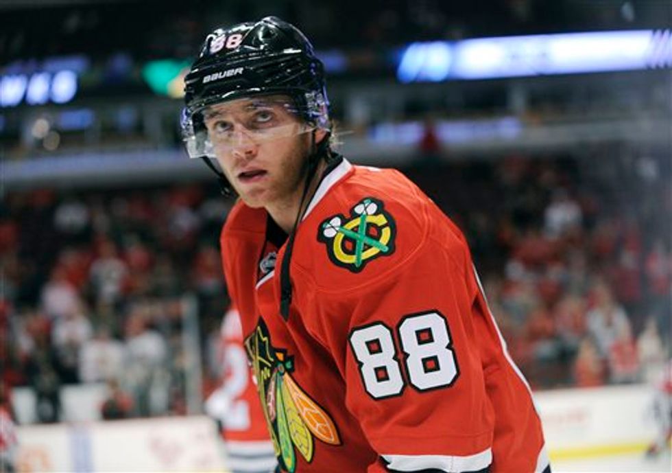 Chicago Blackhawks right wing Patrick Kane (88) warms up before a pre-season NHL hockey game against the Detroit Red Wings in Chicago, Tuesday, Sept. 22, 2015. (AP Photo/David Banks)