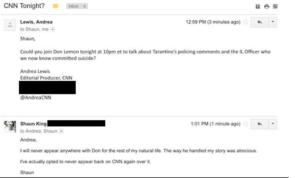 CNN editorial producer Andrea Lewis had emailed King to ask him to appear on Don Lemon's show to talk about the latest developments about Fox Lake, Illinois, police officer Lt. Charles Gliniewicz who died in September and Hollywood director Quentin Tarantino's controversial comments about law enforcement.