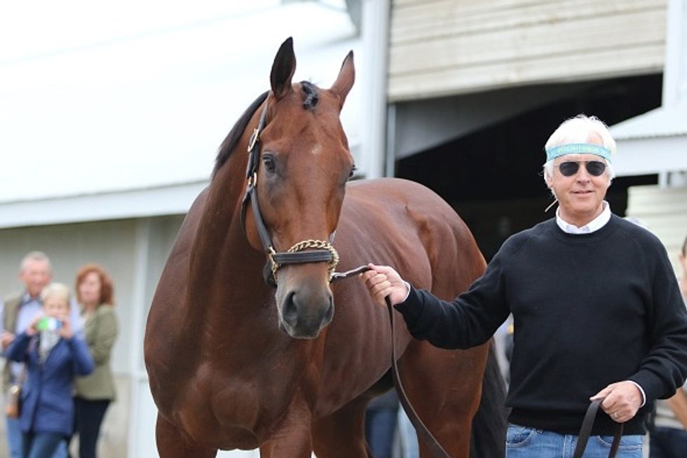 American Pharoah and trainer Bob Baffert outside his barn the morning after winning the Breeders' Cup Classic at Keeneland Race Track, November 1, 2015 in Lexington, Kentucky. (Horsephotos/Getty Images)