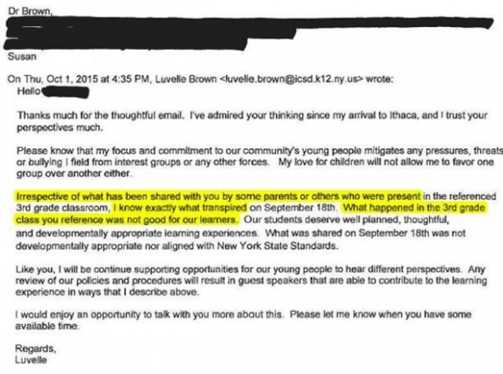 “Irrespective of what has been shared with you by some parents or others who were present … I know exactly what transpired on September 18th. What happened in the 3rd grade class you reference was not good for our learners,” Superintendent of the Ithaca City School District Luvelle Brown wrote in response to someone who apparently had reached out to him.