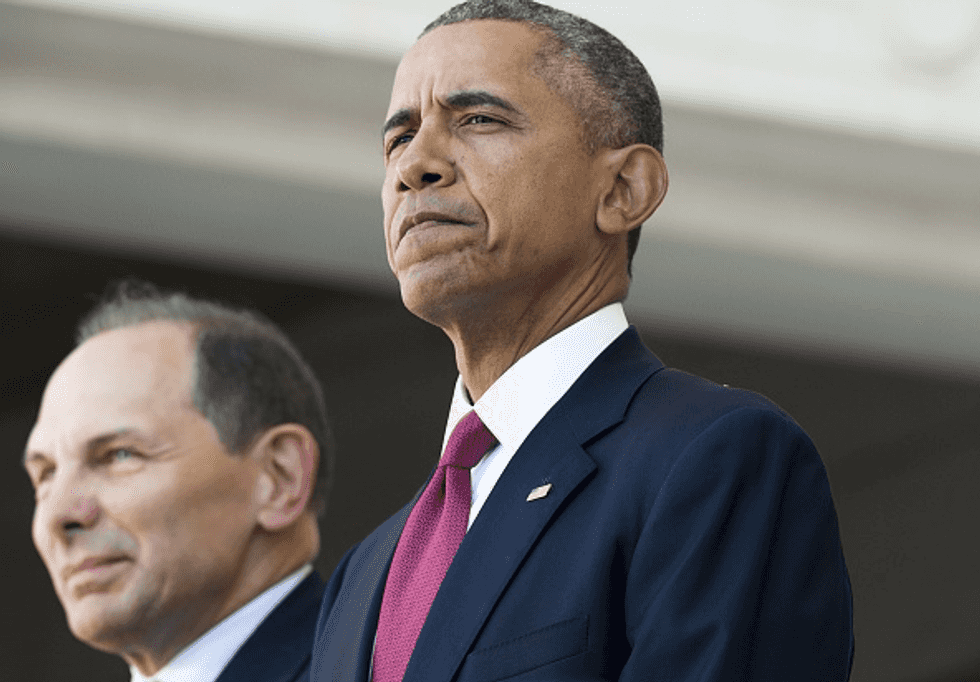 President Barack Obama stands alongside Secretary of Veterans Affairs Bob McDonald, left, during a ceremony in honor of Veterans Day at Arlington National Cemetery in Arlington, Virginia, Nov. 11, 2015. (Saul Loeb/AFP/Getty Images)