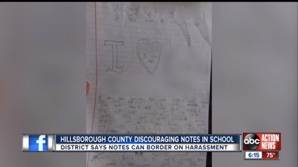 For many, passing "love notes" in elementary school is somewhat of a staple of the early years of grade school, but for one 9-year-old fourth-grader in Tampa, Florida, it could mean sexual harassment.