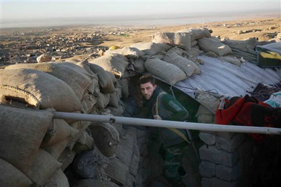 A Kurdish peshmerga fighter pauses during an operation to retake the northern Iraqi town of Sinjar on Thursday, Nov. 12, 2015. Kurdish Iraqi fighters, backed by the U.S.-led air campaign, launched an assault Thursday aiming to retake the strategic town of Sinjar, which the Islamic State overran last year in an onslaught that caused the flight of tens of thousands of Yazidis and first prompted the U.S. to launch airstrikes against the militants. (AP Photo/Bram Janssen)