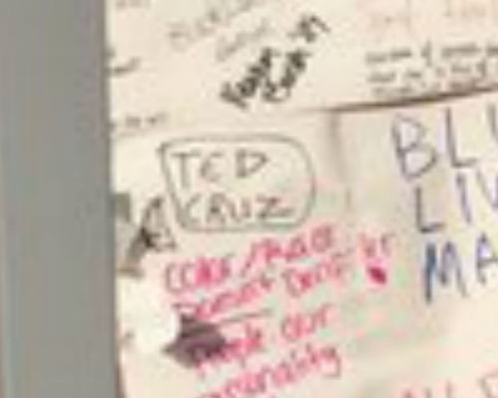 As noted by Twitchy, there were a few surprising messages noticed scrawled on the wall, too.