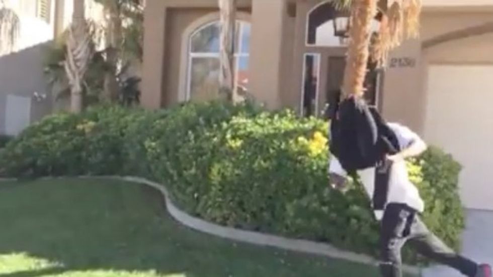 The good neighbor walked outside and confronted the four home intruders. Footage he captured shows the men flee the scene in an SUV stripped of its license plates as he warns them that authorities are on the way.
