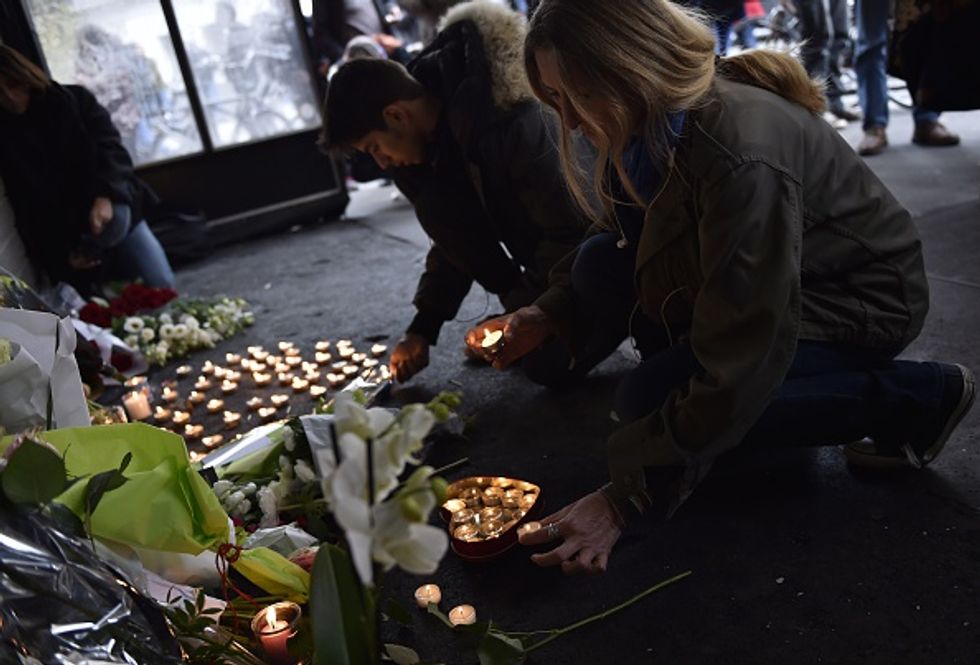 People place flowers and candles outside the cafe 'La Belle Equipe' at the Rue de Charonne in Paris on November 14, 2015, following a series of coordinated attacks in and around Paris late Friday. (LOIC VENANCE/AFP/Getty Images)