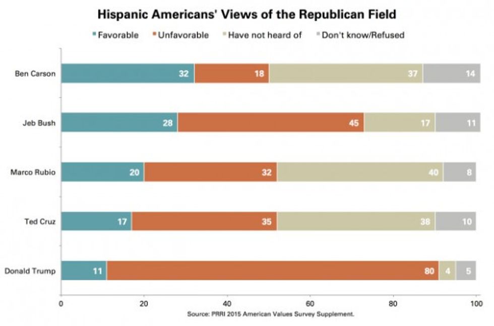 Ben Carson, on the other hand, is viewed as the most favorable Republican candidate by Hispanics, as 32 percent said they have a favorable view of the retired-neurosurgeon, while only 18 percent said they have an unfavorable view. However, 37 percent said they still have not heard of Carson.