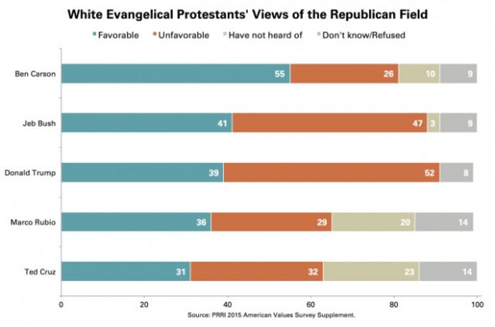 Carson again topped all other candidates as being the most favorable, garnering 52 percent favorability among evangelicals. Only 26 percent of the religious group said they view the doctor unfavorably.