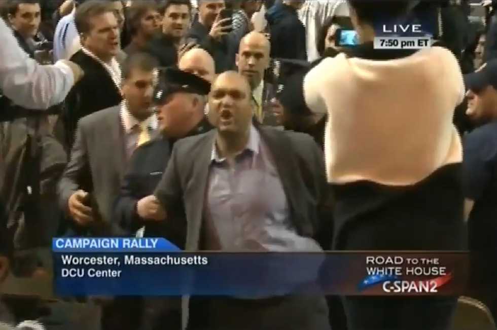 A number of non-uniformed individuals gathered around the heckler and pulled him off the chair in a mini-scuffle before police nabbed the man and escorted him out — and he continued his heckling until he left the camera frame.