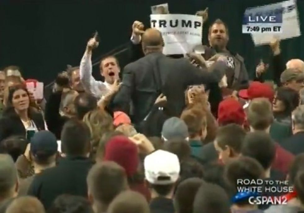 The Republican presidential front-runner then halted his speech while the heckler went on, standing on a chair and shaking his fist at Trump supporters who were yelling back at him and waving campaign signs in his face.