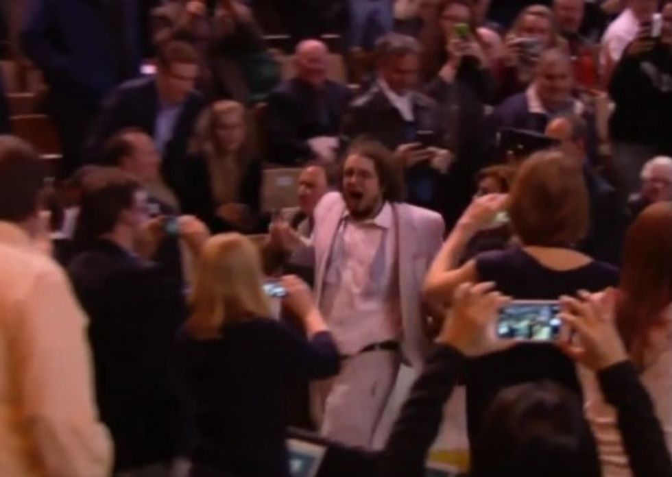 It isn't clear what this heckler was saying, but he met the same fate — escorted from the building along the same path as the other heckler.