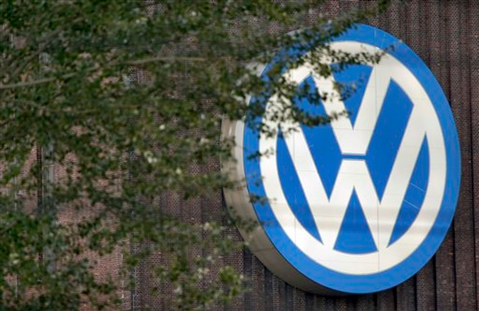 Trees stand in front of giant logo of the German car manufacturer Volkswagen in Wolfsburg, Germany, Saturday, Sept. 26, 2015. (AP Photo/Michael Sohn)