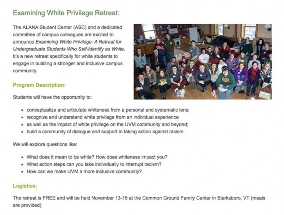 The University of Vermont held a retreat "specifically for white students" last weekend that aimed to illustrate to students the ways in which their "white privilege" gives them an upper hand in society.