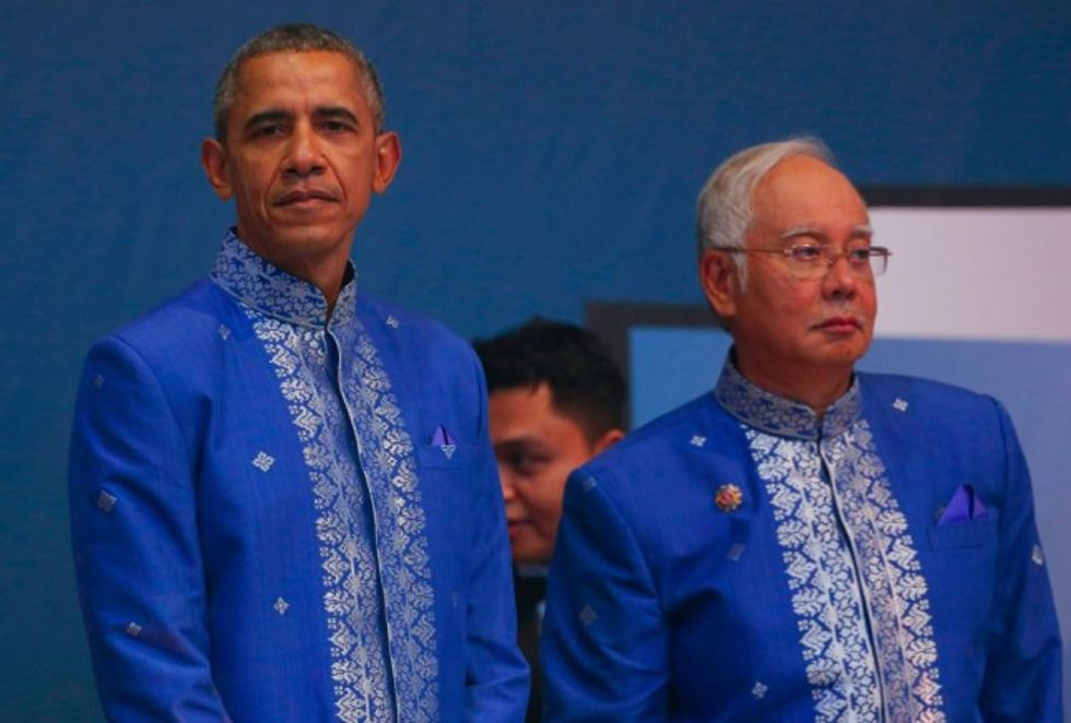 U.S. President Barack Obama, left, stands next to Malaysian Prime Minister Najib Razak during the Gala dinner of the ASEAN Summit in Kuala Lumpur, Malaysia on Saturday, Nov. 21, 2015. (AP Photo/Vincent Thian)