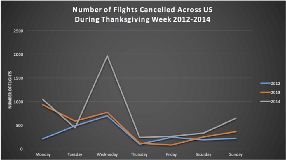 Wednesday of 2014 was by far the worst day during Thanksgiving week to travel in the last few years with the most cancelled.