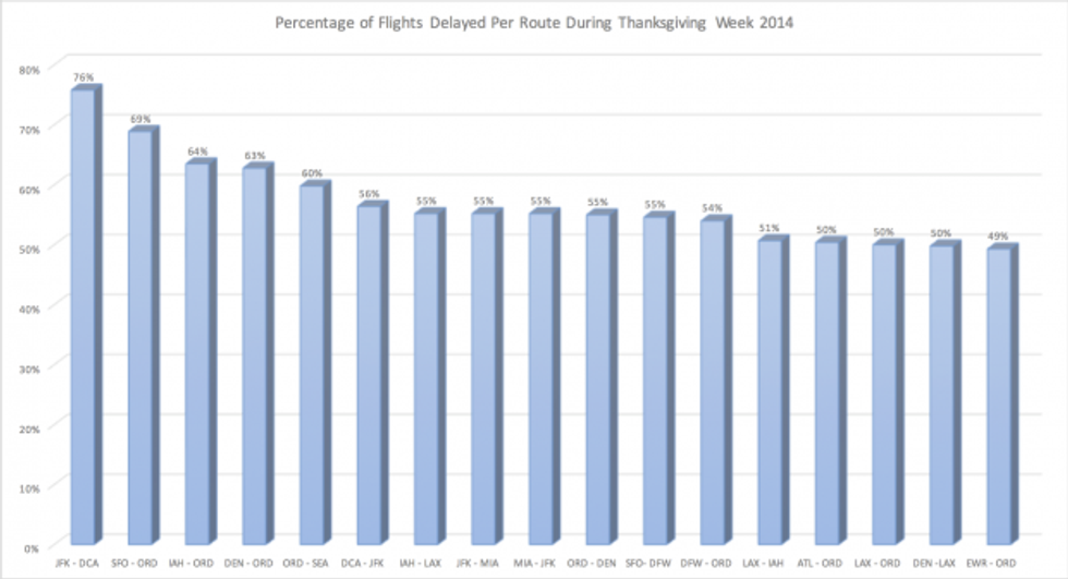 The worst airports (Chicago's O'Hare International Airport took the top spot) to travel out of, based on percentage of delays during Thanksgiving week.