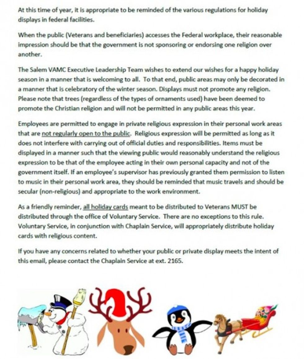 "The email directive muzzles the very religious diversity it purportedly promotes," the letter concluded. "Please respond to this letter in writing with assurances that the Salem VA will respect the rights of its employees and veterans it services."
