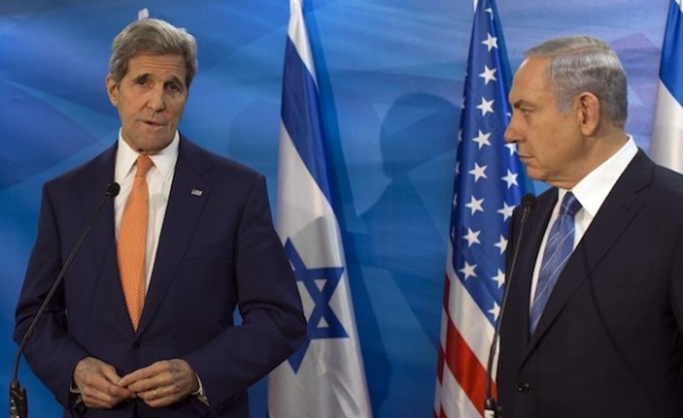 Israel's Prime Minister Benjamin Netanyahu, right, looks at US Secretary of State John Kerry during a meeting at the Prime Minister's Office, in Jerusalem, Tuesday, Nov. 24, 2015. (Atef Safadi/Pool Photo via AP)