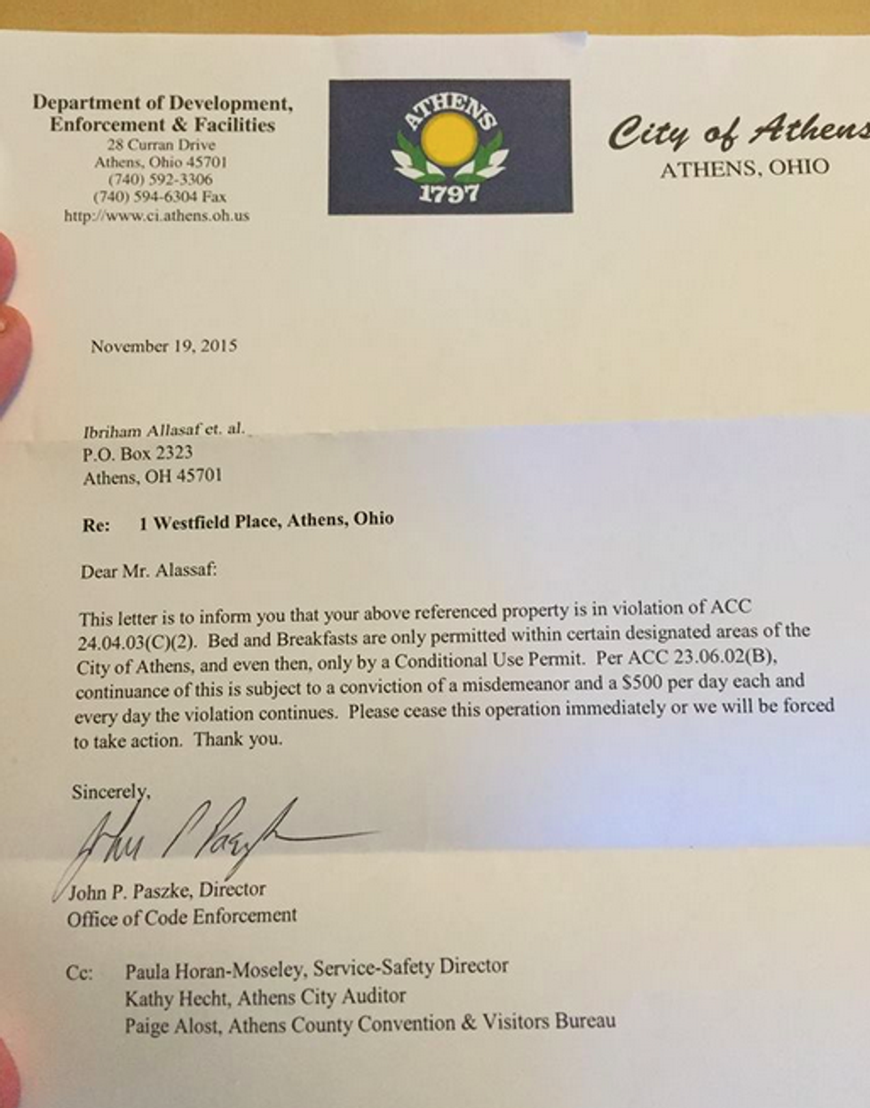 "Bed and breakfasts are only permitted within certain designated areas of the City of Athens, and even then, only by a Conditional Use Permit," John Paszke, director of the city's Code Enforcement, wrote in a letter provided to TheBlaze.