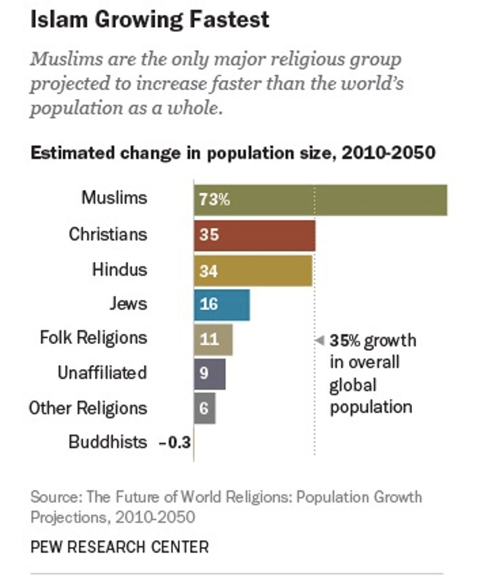 “Between 2010 and 2050, the world’s total population is expected to rise to 9.3 billion, a 35% increase,” Pew reported. “Over that same period, Muslims – a comparatively youthful population with high fertility rates – are projected to increase by 73%. The number of Christians also is projected to rise, but more slowly, at about the same rate (35%) as the global population overall.”