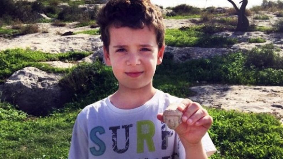 Itai Halperin, 8, holds the First Temple-era figurine he found while he was hiking with his family at an archaeological site. (Image source: Israel Antiquities Authority/Arik Halperin)