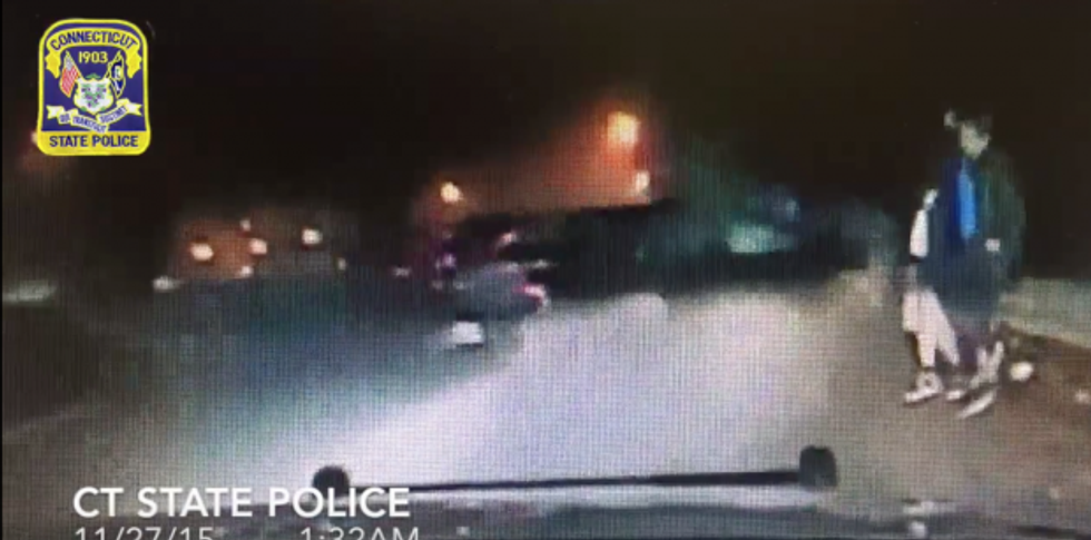 Rojas' car came within inches of a state police cruiser and just missed two men standing in the shoulder along Interstate 95 in Fairfield on Friday morning. This screengrab from the video shows just how close the people were to being hit: