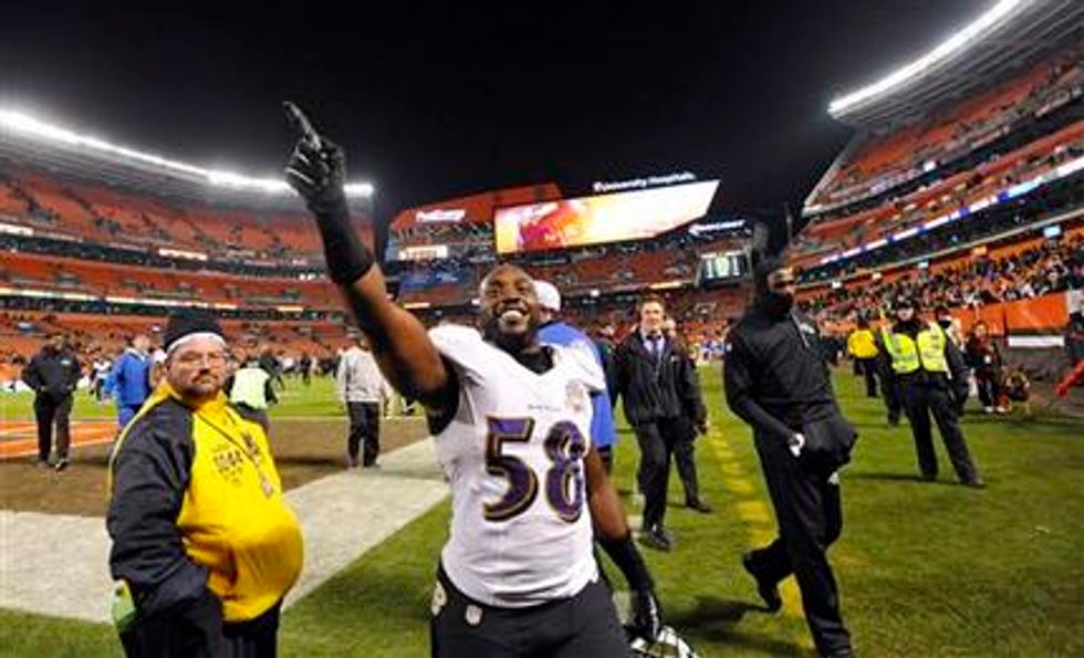 Baltimore Ravens outside linebacker Elvis Dumervil (58) celebrates after the Ravens defeated the Cleveland Browns 33-27 in an NFL football game, Monday, Nov. 30, 2015, in Cleveland. (AP Photo/David Richard)