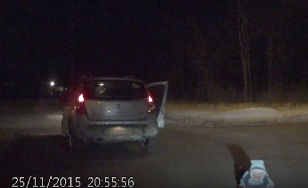 An adult stopped and exited the vehicle about 30 feet ahead of the toddler, picked up the child and returned to the vehicle.