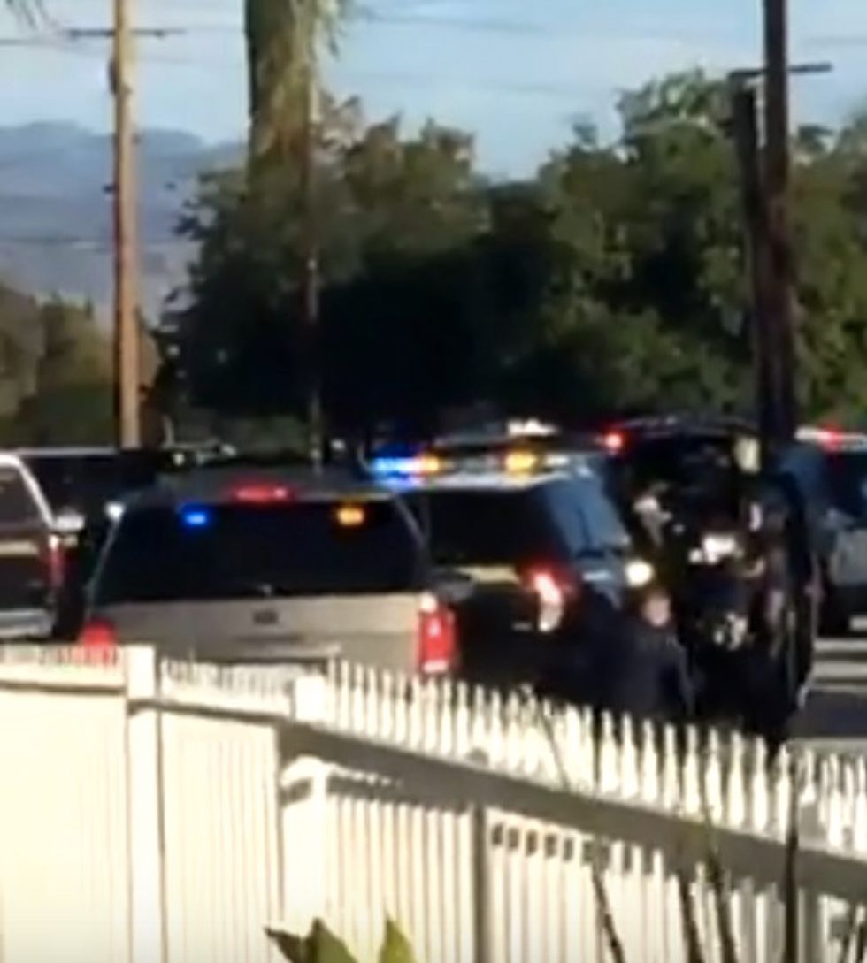 A resident walked out of his house Wednesday and captured on video the moment police caught up with two suspects in the San Bernardino shooting and the subsequent barrage of gunfire just a few doors down his street.