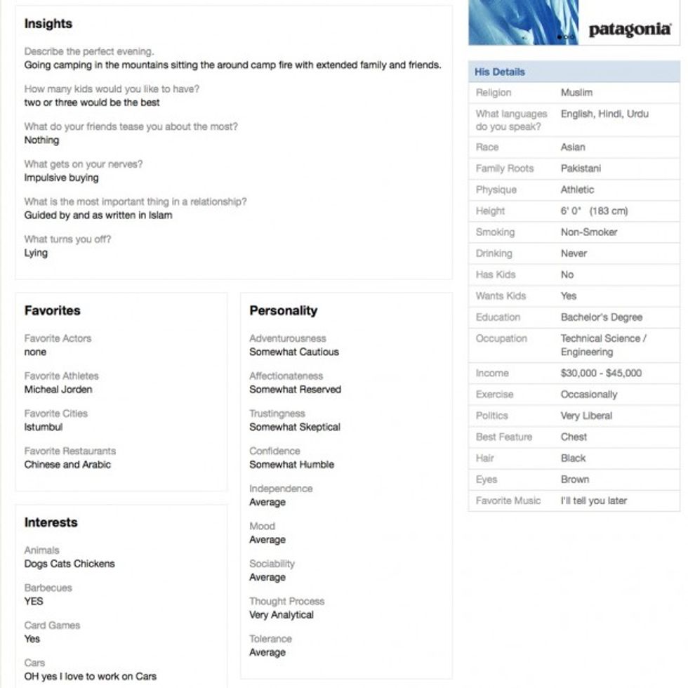 "I am born and raised here, I try to live as a good Muslim, looking for a girl who has the same outlook, wear hijab, but live the life to the fullest, be my partner for snow boarding, to go out and eat with friends, go camping, working on cars with me. Also be calm cool thought full, love to spend time with friends and family," he wrote.