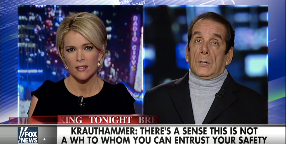 "I think one of the reasons for the true widespread and deep anxiety in the country, insecurity — reflected for example in the increase in purchase of firearms — is that people feel that the authorities, particularly the president, the White House, the ultimate authorities, simply are clueless about what's happening," Krauthammer said. "Either they had no idea what to do about it and thus deny its existence or its importance or its severity, or that the president truly doesn't believe that this is a major threat to the security of his own people."