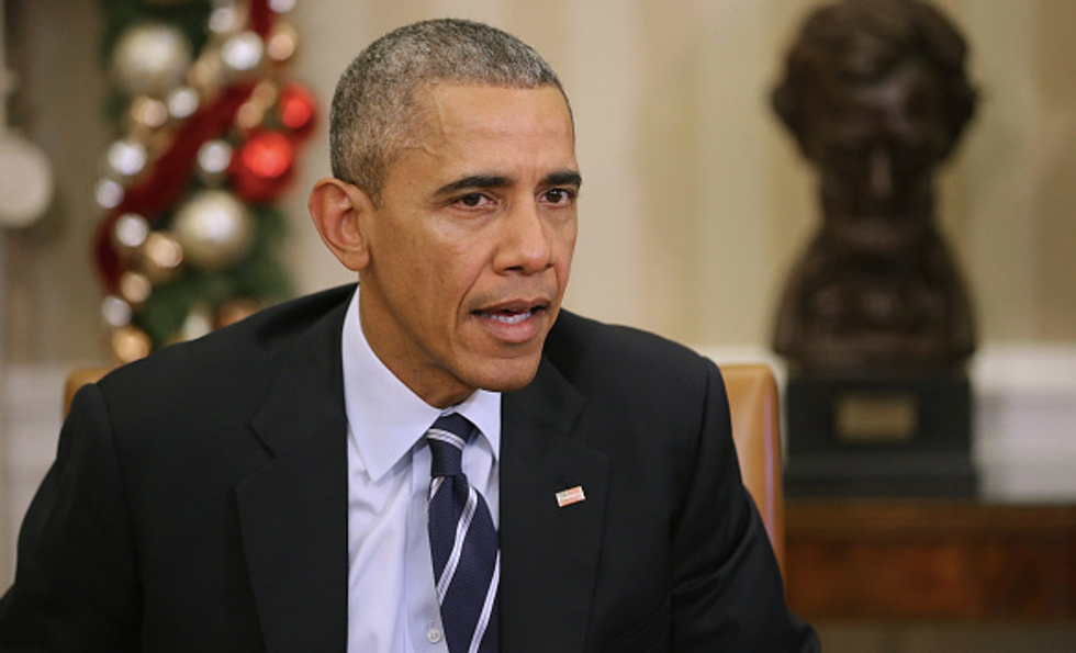 President Barack Obama makes a statement on Wednesday's mass shooting in San Bernardino, Calif., Thursday, Dec. 3, 2015, in the Oval Office of the White House in Washington. (AP Photo/Evan Vucci)