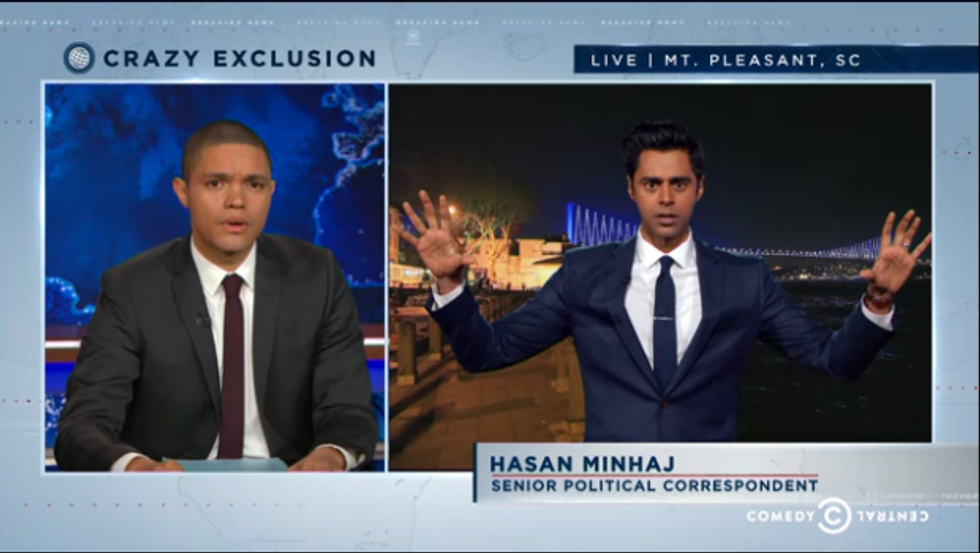 The Comedy Central correspondent explained his reasoning, but then he went a step further, comparing Trump to the Islamic State. "One-third of a major political party in America is backing a racist maniac. This place is scary right now," Minhaj told Noah. "Donald Trump is an extremist leader who came out of nowhere, he's self-financed, recruits through social media, attracts his followers with a radical ideology to take over the world, and is actively trying to promote a war between Islam and the West. ... That's right, Trevor, Donald Trump is White ISIS — WISIS."