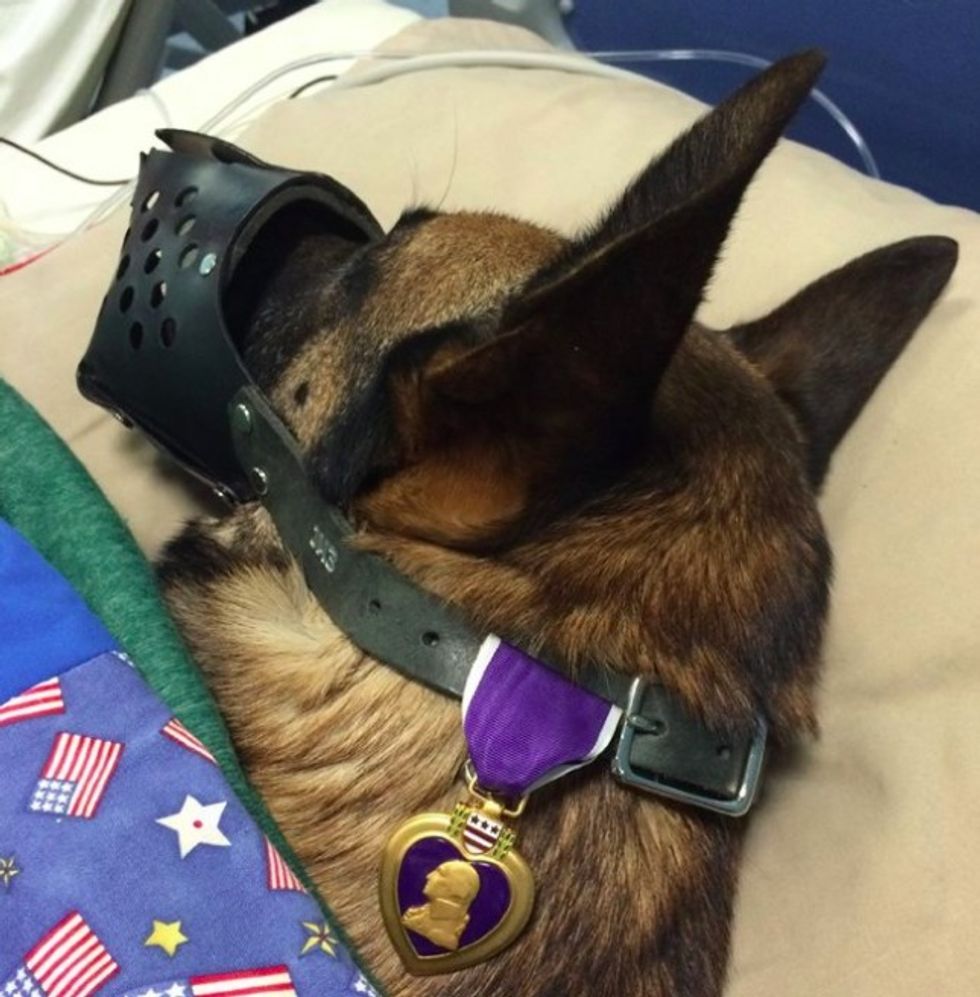 A photo of the dog — named Rocky — wearing a Purple Heart from a head strap while resting under a cover has gone viral.