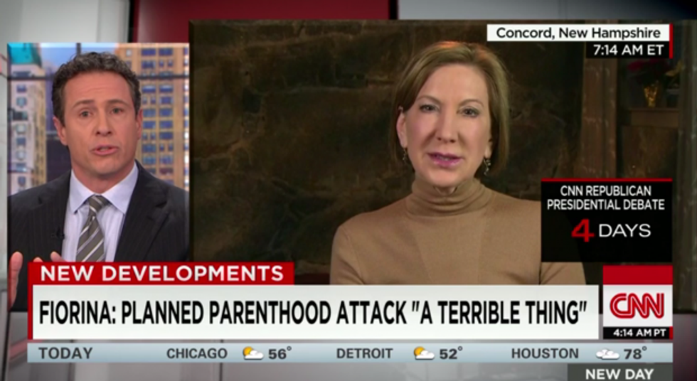 Republican presidential candidate Carly Fiorina snapped at CNN host Chris Cuomo when he asked her if she regrets her past comments condemning Planned Parenthood following the deadly shooting in Colorado.