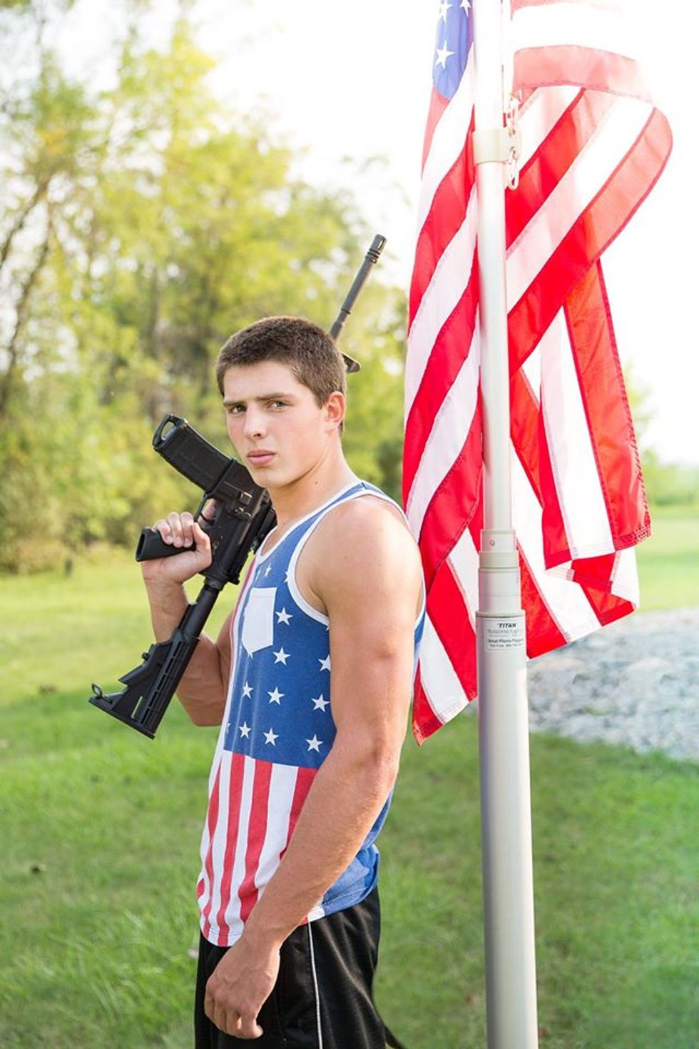 The high school senior is seen in the picture wearing a red, white and blue tank top in front of the American flag, while resting a rifle on his shoulder.