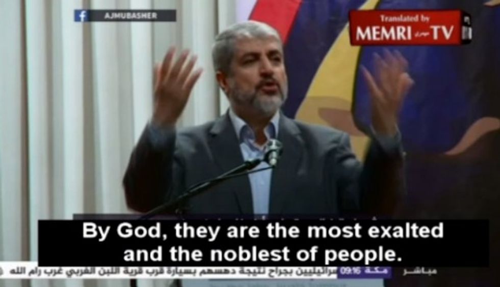 Hamas leader Khaled Mashaal praised Palestinians assailants as “the most exalted and the noblest of people.” (Image source: MEMRI)\n