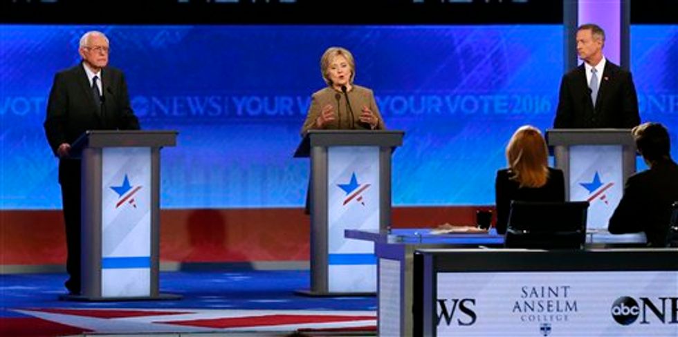 Hillary Clinton, center, speaks between Bernie Sanders, left, and Martin OMalley during a Democratic presidential primary debate Saturday, Dec. 19, 2015, at Saint Anselm College in Manchester, N.H. (AP Photo/Jim Cole)\n