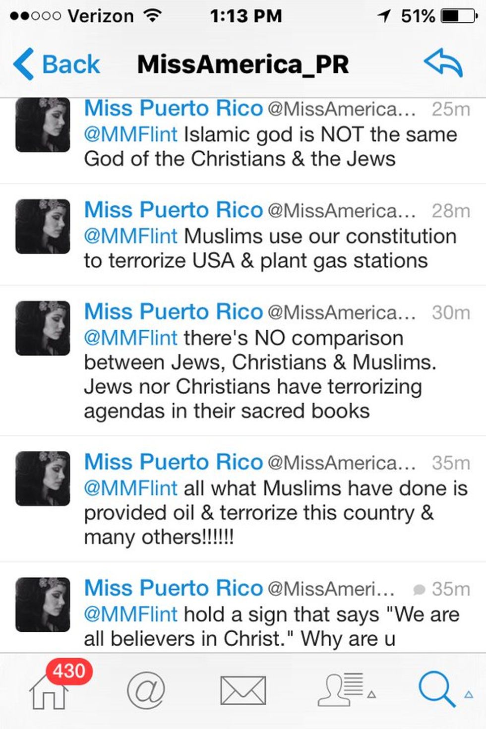 Miss Puerto Rico was suspended Saturday from representing the Miss America organization after issuing a series of tweets taking aim at filmmaker Michael Moore and, more broadly, Islam.