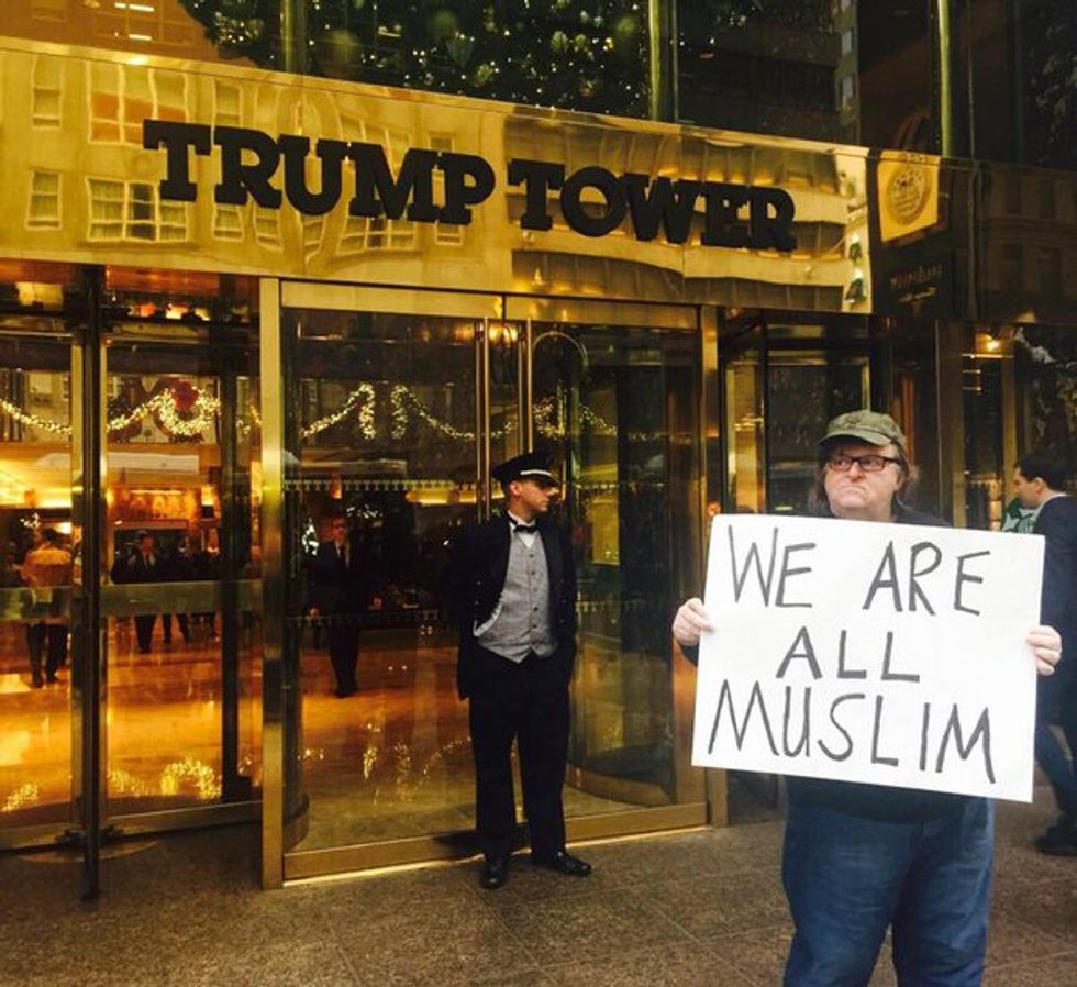 Véles referring to Moore's stunt outside Trump Tower in New York when he held a sign saying, "We are all Muslim."