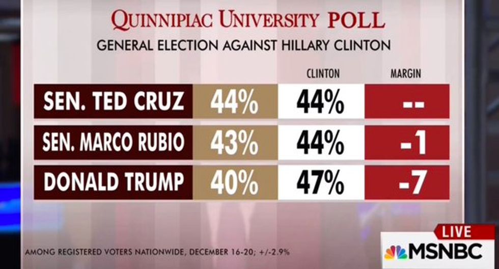 The poll also found that following last Tuesday's Republican debate, Cruz continues to chip away at Trump's massive lead. While the Real Clear Politics national average has Trump's lead at more than 15 points, the Quinnipiac poll found that Trump is leading Cruz by only four points, 28 percent to 24 percent.