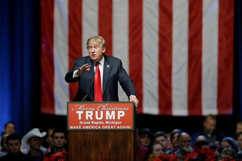 Republican presidential candidate, businessman Donald Trump addresses supporters at a campaign rally, Monday, Dec. 21, 2015, in Grand Rapids, Mich. (AP Photo/Carlos Osorio)