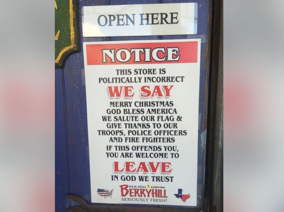 About two weeks ago, Berryhill Baja Grill, a restaurant chain that specializes in Mexican cuisine, posted notices outside each of their nine locations warning their customers that the restaurant is "politically incorrect" and that staff may say "Merry Christmas" and "God Bless America."