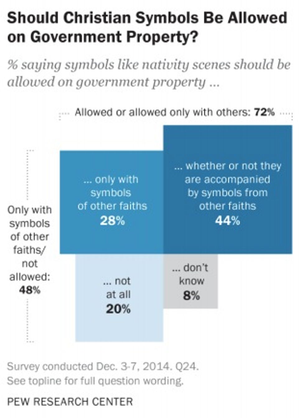 Forty-four percent of Americans said Christian symbols such as the Nativity should be allowed on public property.