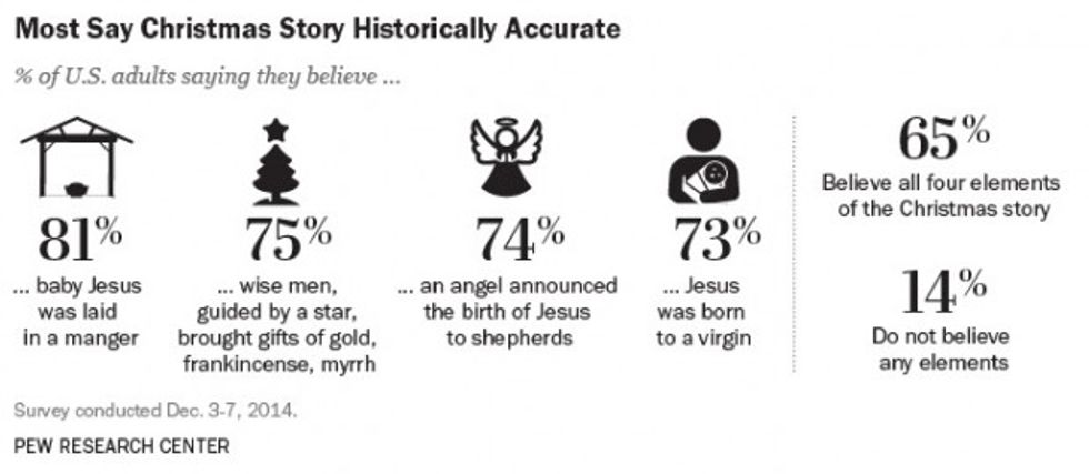 Pew asked Americans if Jesus was born to a virgin, if he was laid in a manger, if wise men brought gifts to him, and if an angel of the Lord appeared to shepherds to announce his birth.