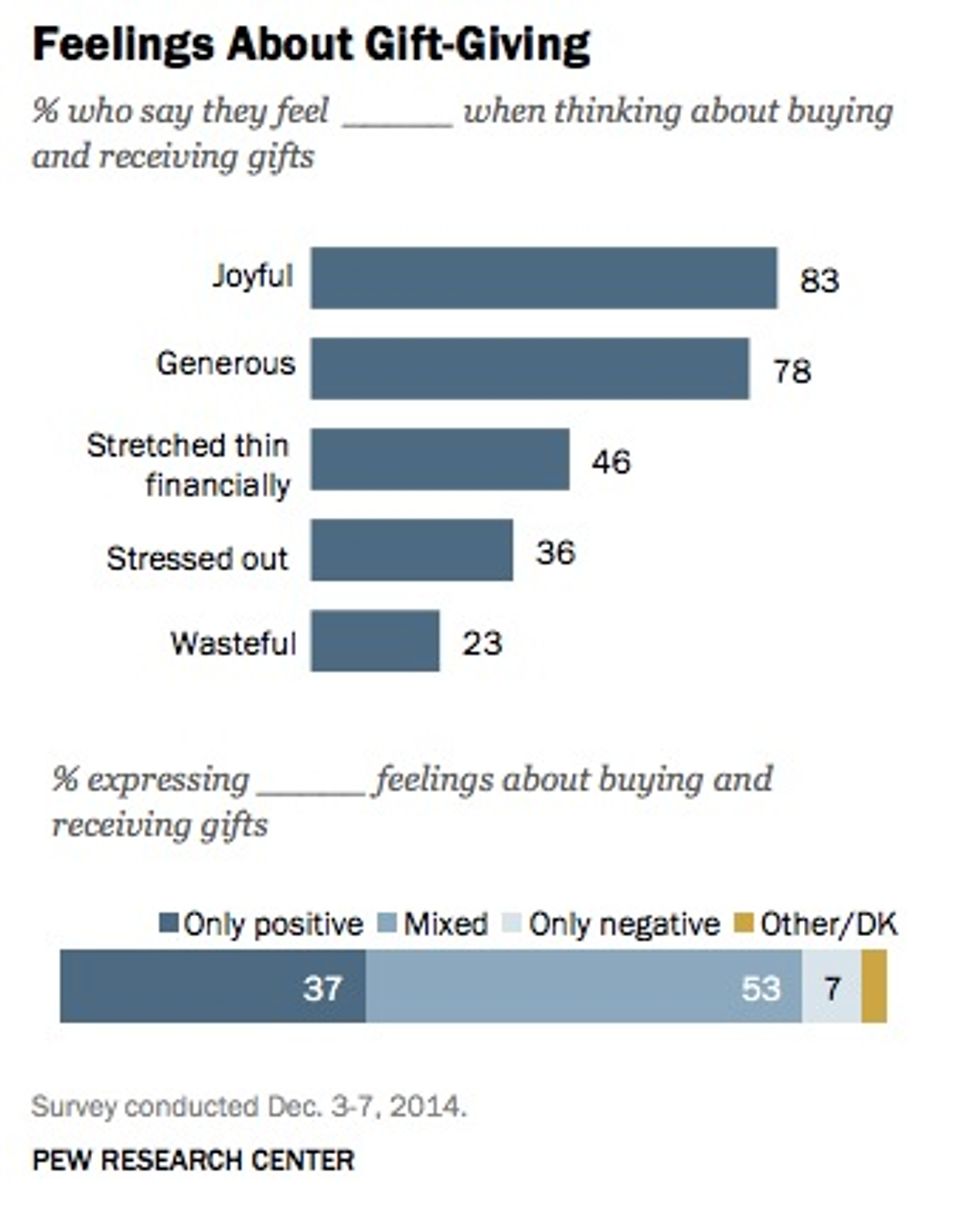 Fifty-three percent of Americans said they have mixed feelings about giving and receiving gifts, while 37 percent said that they have only positive feelings, and a mere 7 percent said they have only negative feelings.
